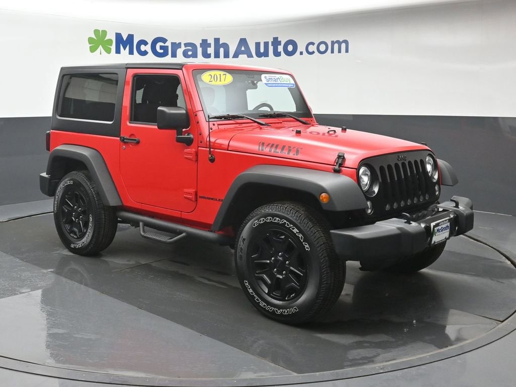 Discover the Rugged Charm of the 2017 Jeep Wrangler Willys WheelerThis 2017 Jeep Wrangler Willys Wheeler is a true off-road icon, blending timeless style with uncompromising capability. With its distinctive Willys Wheeler package, this Wrangler is ready to take you on unforgettable adventures, whether you're conquering the trails or navigating the city streets.- Clean Carfax- Quick Order Package 24K Willys Wheeler- Dual Top Group- LED Lighting Group- Trailer Tow GroupPowered by a robust 3.6L V6 engine and equipped with a 5-speed automatic transmission, this Wrangler delivers the perfect balance of power and control. Boasting 4-wheel drive, you'll have the confidence to tackle any terrain, while the Willys Wheeler package adds a unique flair with its distinct grille, hood decal, and rock rails.Climb inside and you'll be greeted by a host of premium features, including Uconnect voice command with Bluetooth, a leather-wrapped steering wheel, and a premium sound system. The dual-top configuration, with both a black 3-piece hard top and a premium black sunrider soft top, allows you to customize your driving experience to suit your mood and the weather.Whether you're an avid off-roader or simply seeking a versatile and stylish SUV, this 2017 Jeep Wrangler Willys Wheeler is an exceptional choice. With its impressive capabilities, distinctive styling, and well-appointed interior, it's the perfect companion for your next adventure.We invite you to experience the thrill of the Wrangler Willys Wheeler for yourself. Visit our showroom today and let our knowledgeable team guide you through the features and benefits of this remarkable vehicle. We're confident you'll be captivated by its rugged charm and eager to make it your own.Prices may change at any time and are subject to availability and prior sale. Taxes, title, license fees, and a $180 documentation fee are not included. Pricing reflects all applicable rebates and incentives assigned to the dealer. Example payments are estimates; actual terms vary based on credit approval. APR and payment estimates apply to qualified buyers, not all buyers qualify for advertised rates. Factory cash incentives may not be combined with promotional APR. Fuel economy ratings and driving range figures are based on EPA estimates for new vehicles, and actual mileage and range may vary. Some in-stock vehicles may include a $1,295 Clear Guard Protection package By submitting your phone number online, you consent to occasional SMS or voice calls about our products and promotions; standard messaging rates may apply. Consult dealer for offer eligibility and other details. Factory MSRP is not the final advertised/asking price of the vehicle. Fuel economy figures are EPA estimates.